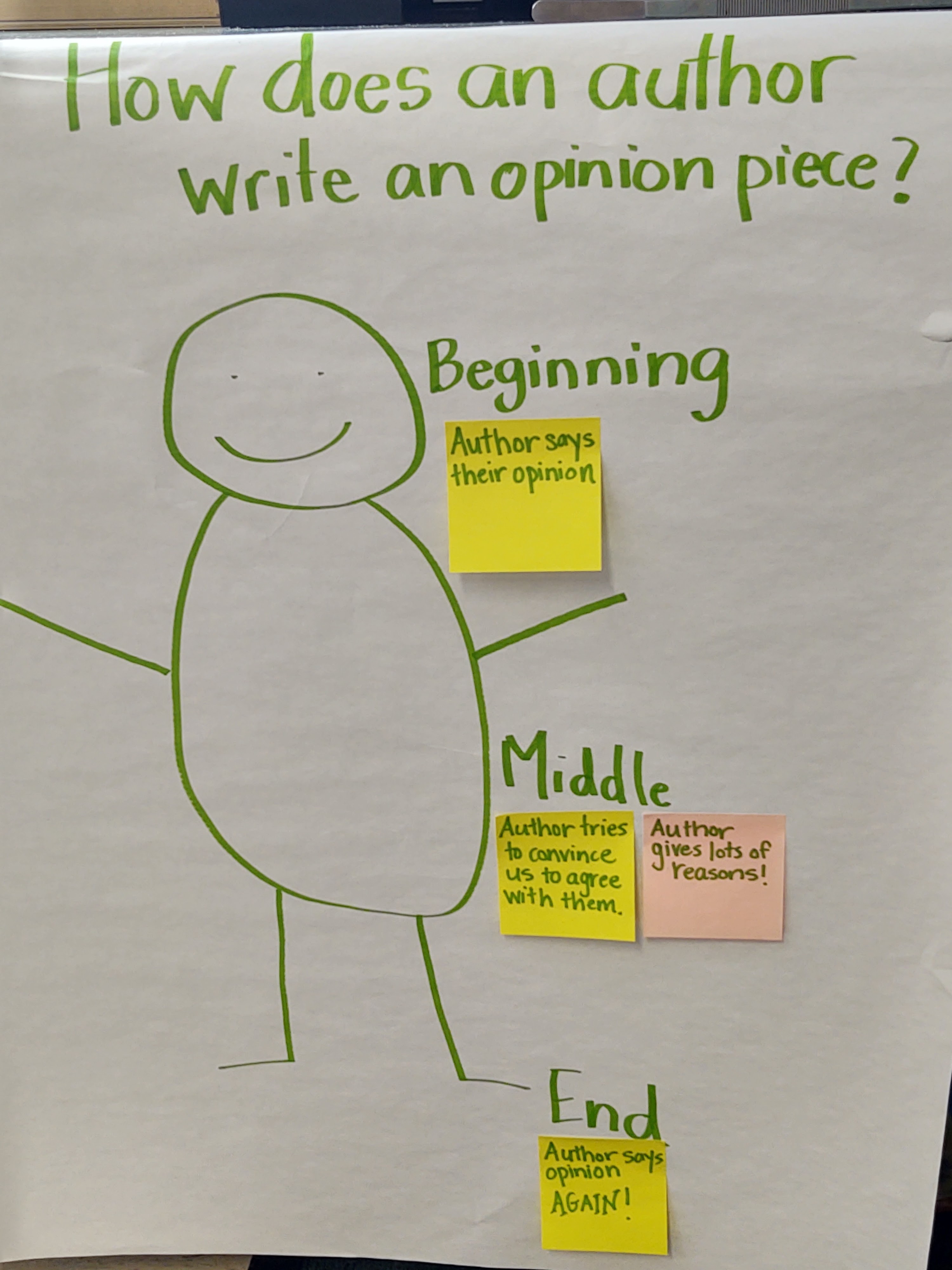 Last week, the first and second graders explored what an opinion is and how mentor authors write about their opinions. We made several anchor charts together which we will reference throughout this unit of study.  We worked to show the beginning, middle and end of an opinion piece, and how authors give reasons to support their opinion. We studied the author Mo Willems, and enjoyed his humor and author's craft moves!